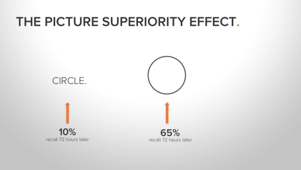 In one experiment, for instance, subjects who were presented with information orally could remember about 10% of the content 72 hours later. Those who were presented with information in picture format were able to recall 65% of the content.