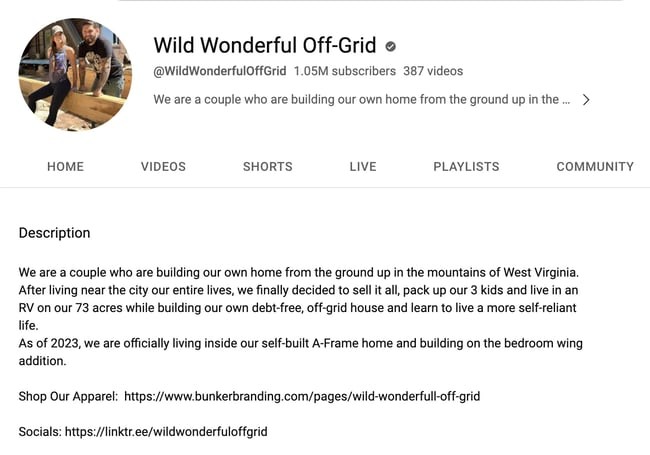 Wild Wonderful Off-Grid's YouTube channel description positions the channel within a niche by using the keywords "off-grid," "self-reliant," and "building our own home" to appeal to viewers who are interested in living off-the-grid. The description also invites viewers to visit their online store and social media profiles.