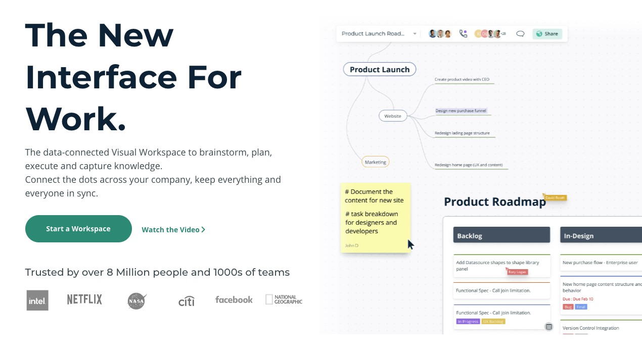 Miro’s interactive Mind Map tool enables distributed and remote teams to collaborate, brainstorm, and build on shared digital canvas. Their product creates a convenient, centralized hub for teams to organize assets, strategize, stay aligned, and work together in real time.