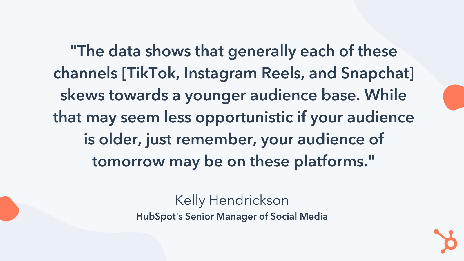 Additionally, in regards to TikTok, Instagram Reels, or Snapchat, Hendrickson told me, "The data shows that generally each of these channels skews towards a younger audience base. While that may seem less opportunistic if your audience is older, just remember, your audience of tomorrow may be on these platforms."