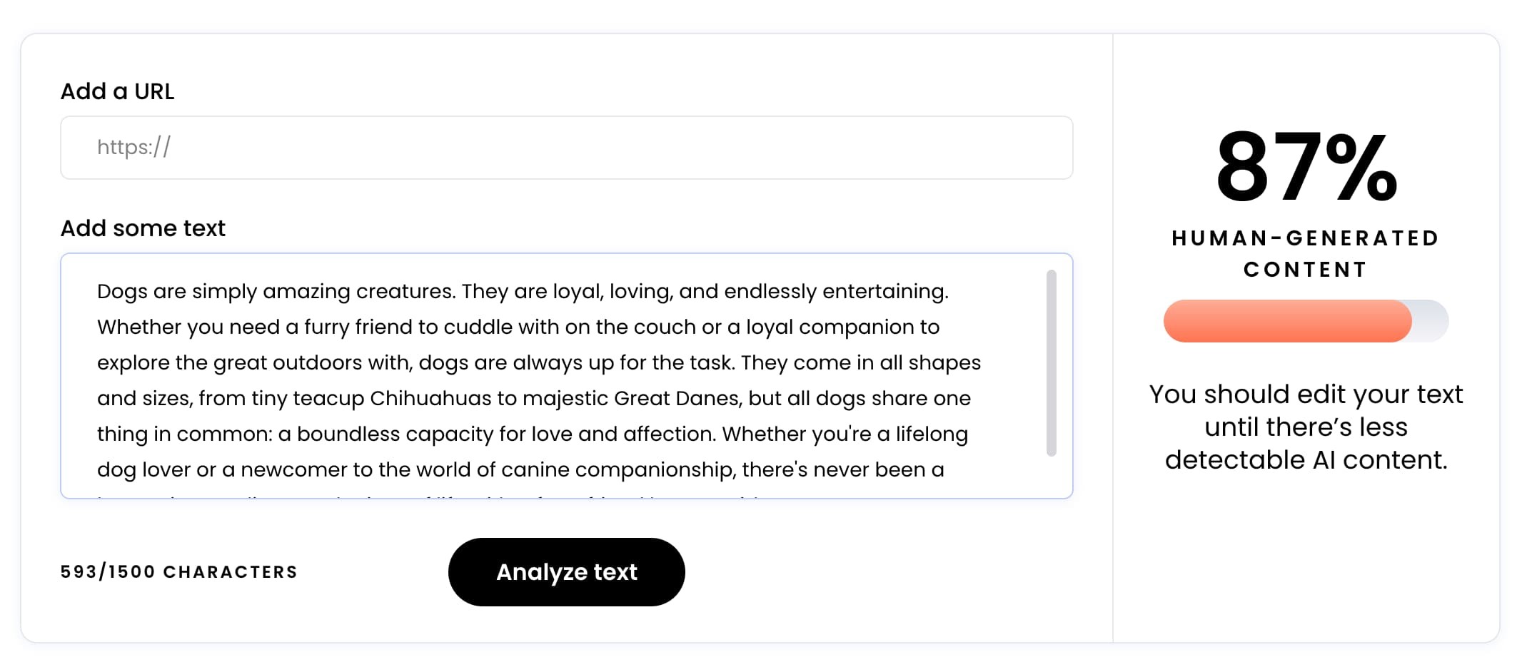 It scored my paragraph as 87% human-generated, with a recommendation to edit the text until there’s less detectable AI content.