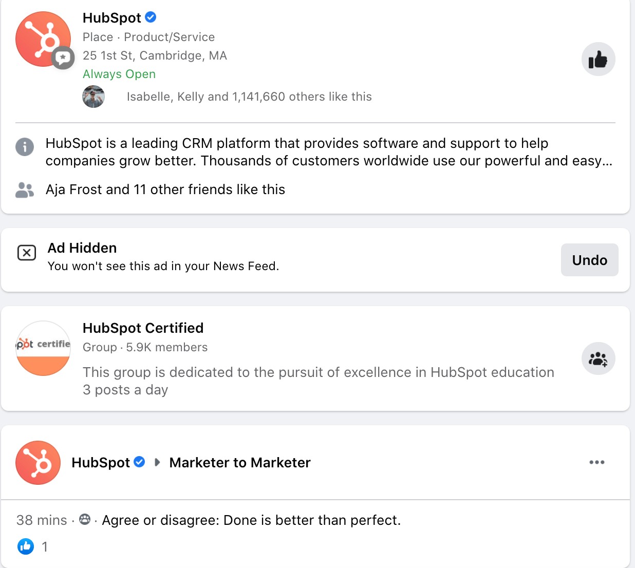 For instance, HubSpot has a few dedicated groups for various, niche purposes like HubSpot education or HubSpot marketers. It's critical Facebook users are able to find the more general, official HubSpot Page when searching "HubSpot", which is why it's good HubSpot's Page has a verified badge, which enables it to rise to the top of search results: