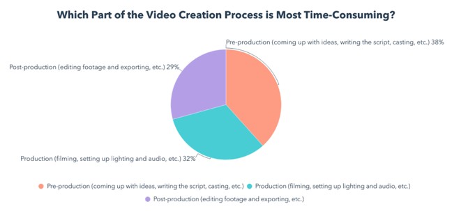 The most time-consuming part of the video creation process is pre-production (coming up with ideas, writing script, casting, etc.), according to 38% of those who make marketing videos in-house.