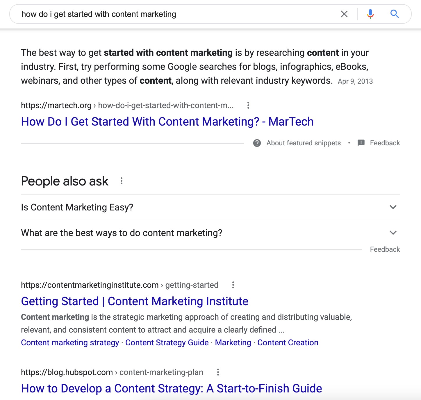 However, if I instead search "How do I get started with content marketing", Google does not provide definitions of content marketing, because my intent is different: